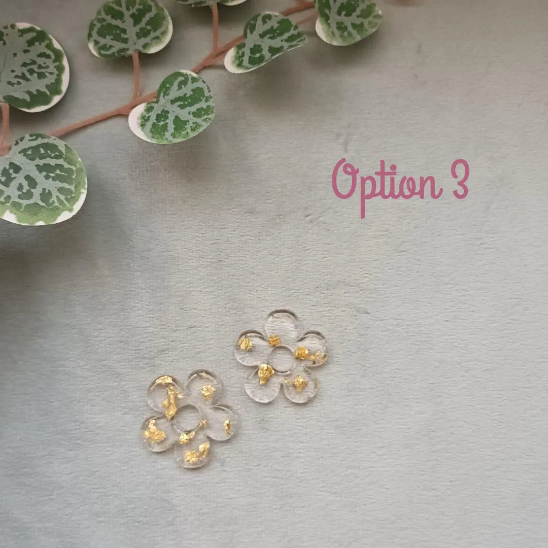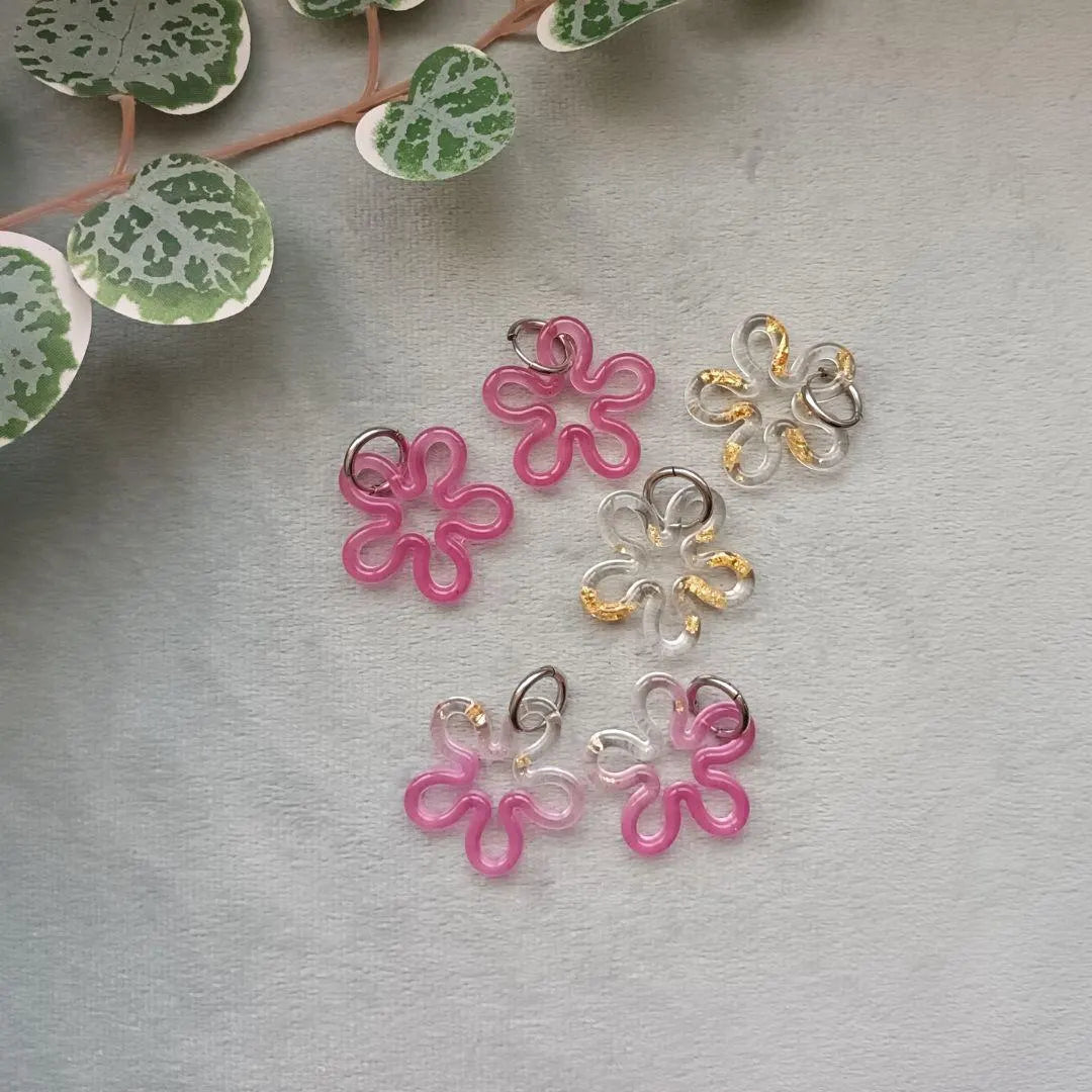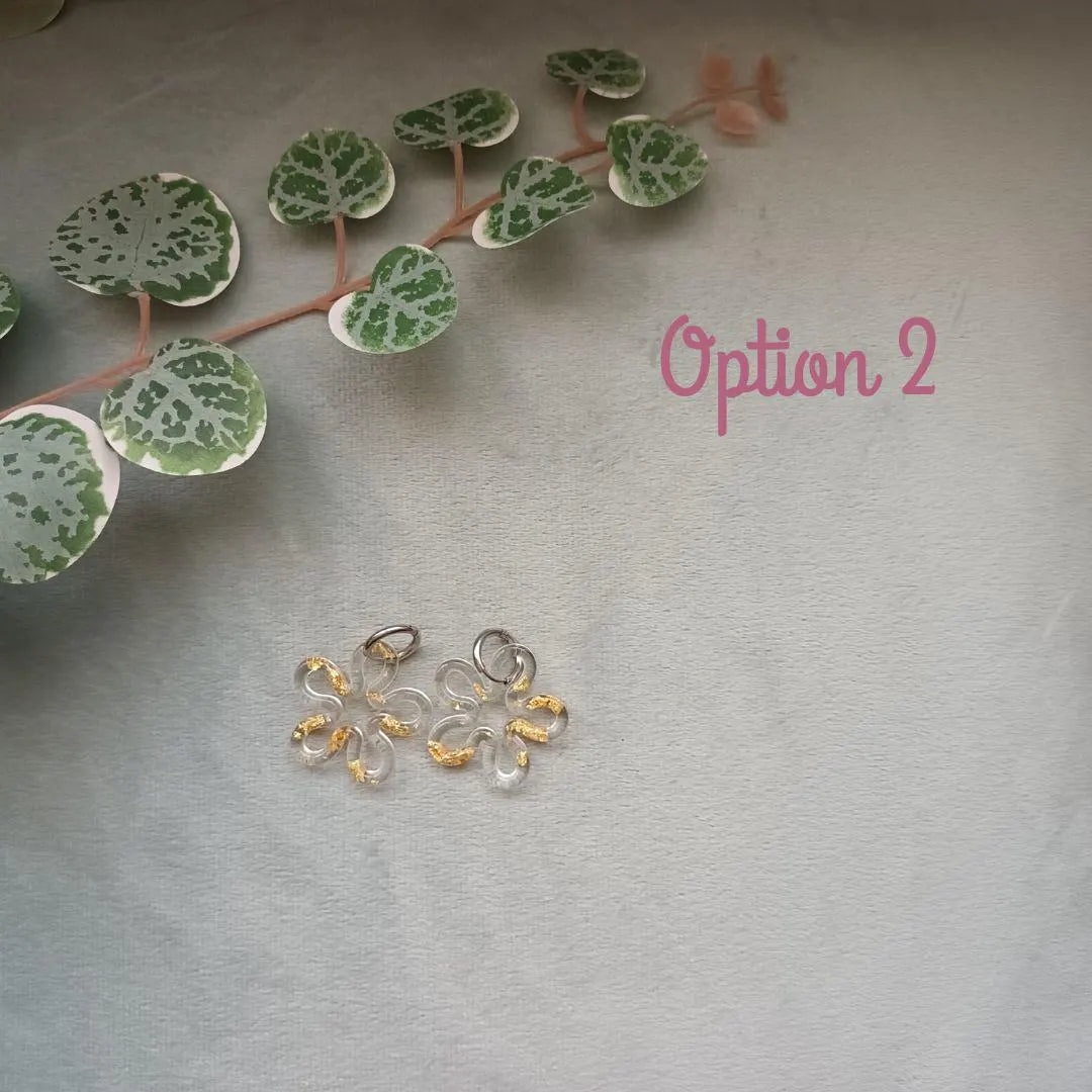 Lot de 2 Pampilles fleur en résine – Collection Violetta – 3 variantes : rose transparent, feuilles dorées, moitié-moitié