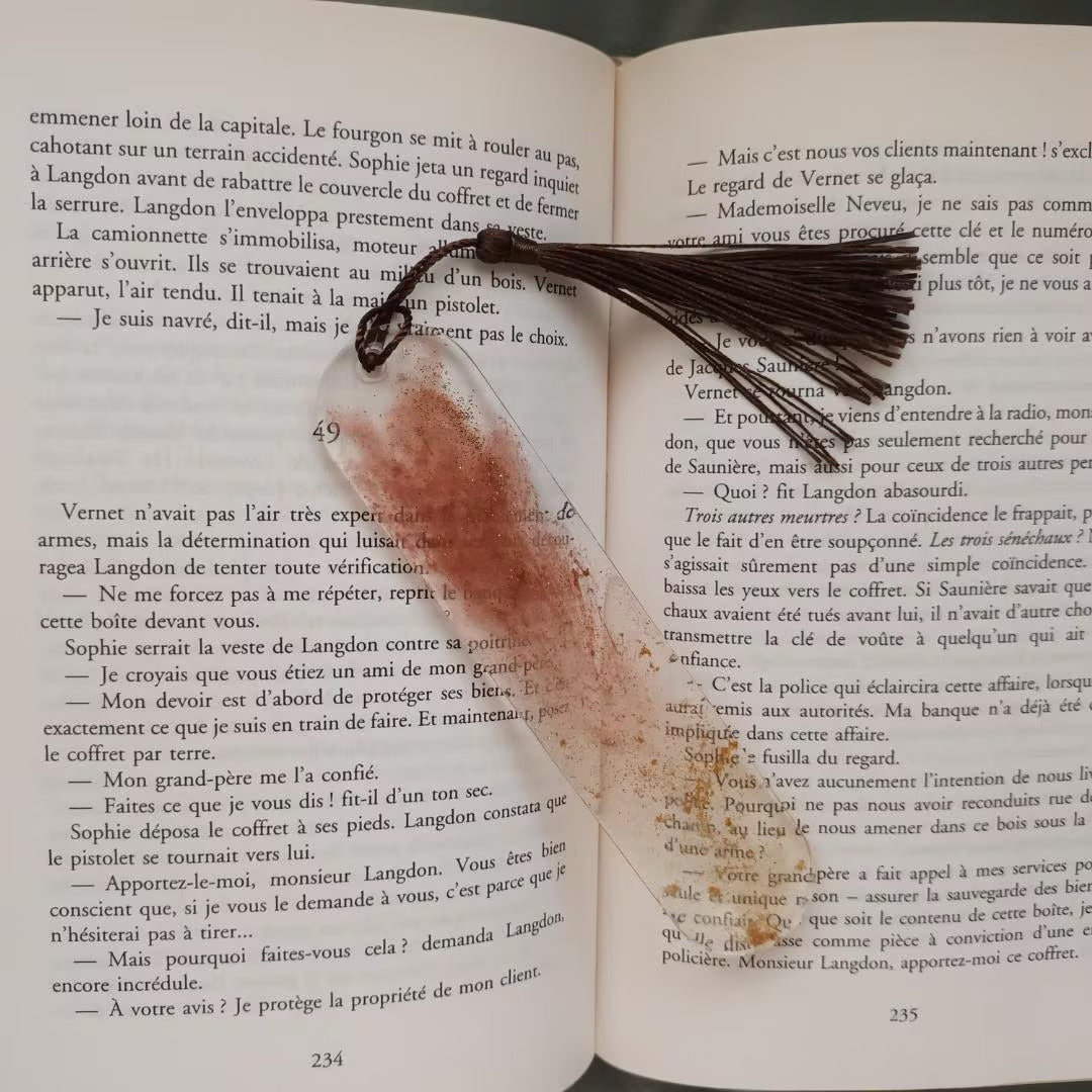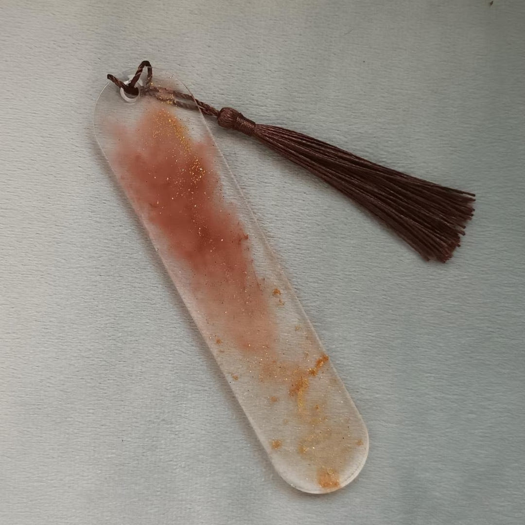 Marque-page en résine fait main – Collection Terre Pailletée – Transparent, brun & paillettes dorées