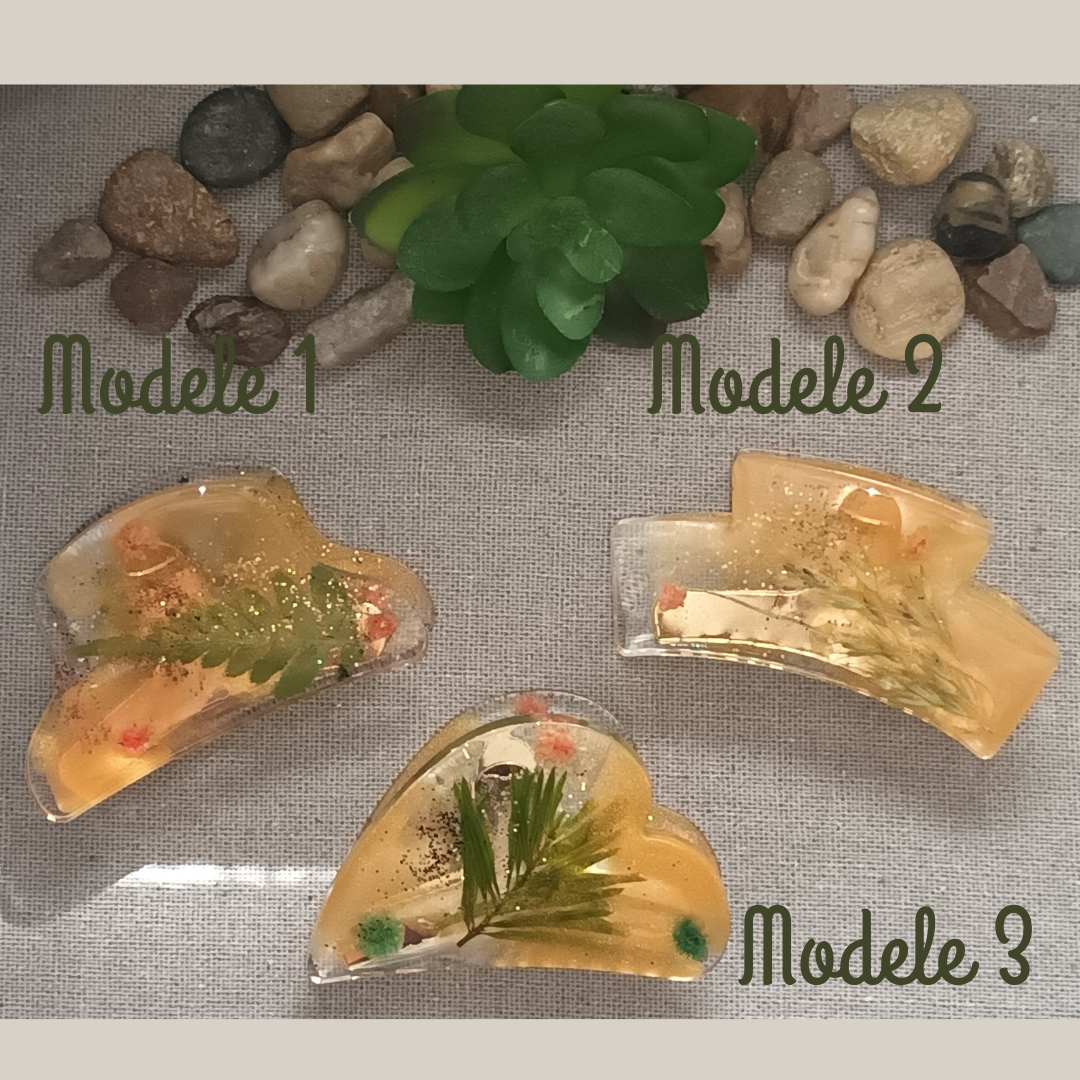 Pince à cheveux croco en résine avec inclusions naturelles : feuilles et fleurs séchées et reflets bronze/cuivré. Pratique et décorative, elle apporte une touche automnale à vos coiffures.