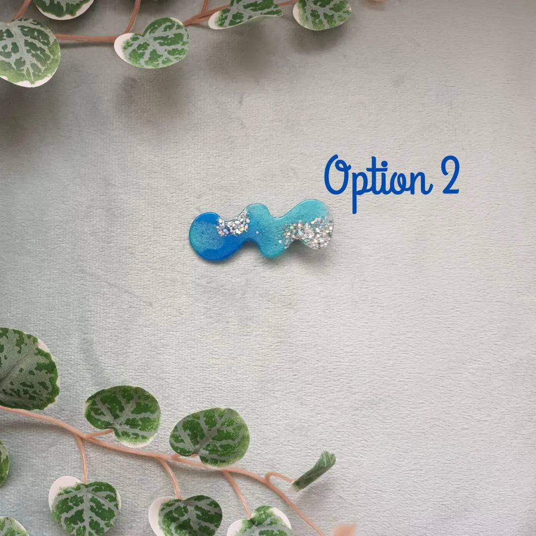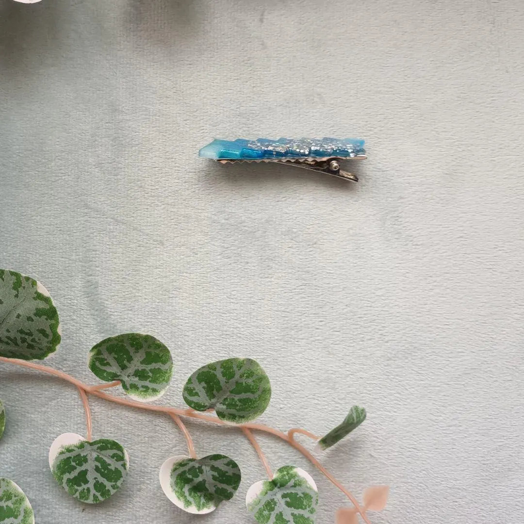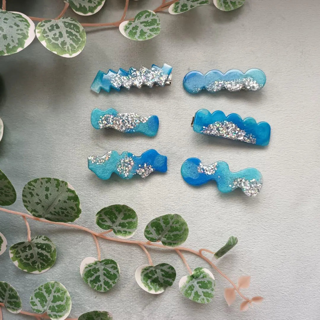 Laissez-vous emporter par la douceur des vagues avec les pinces à cheveux de la collection Océane. Chaque pièce est coulée à la main dans une résine bleue translucide, mêlant des nuances de bleu profond, turquoise et azur, rehaussées de paillettes argentées scintillantes comme l’écume de mer.