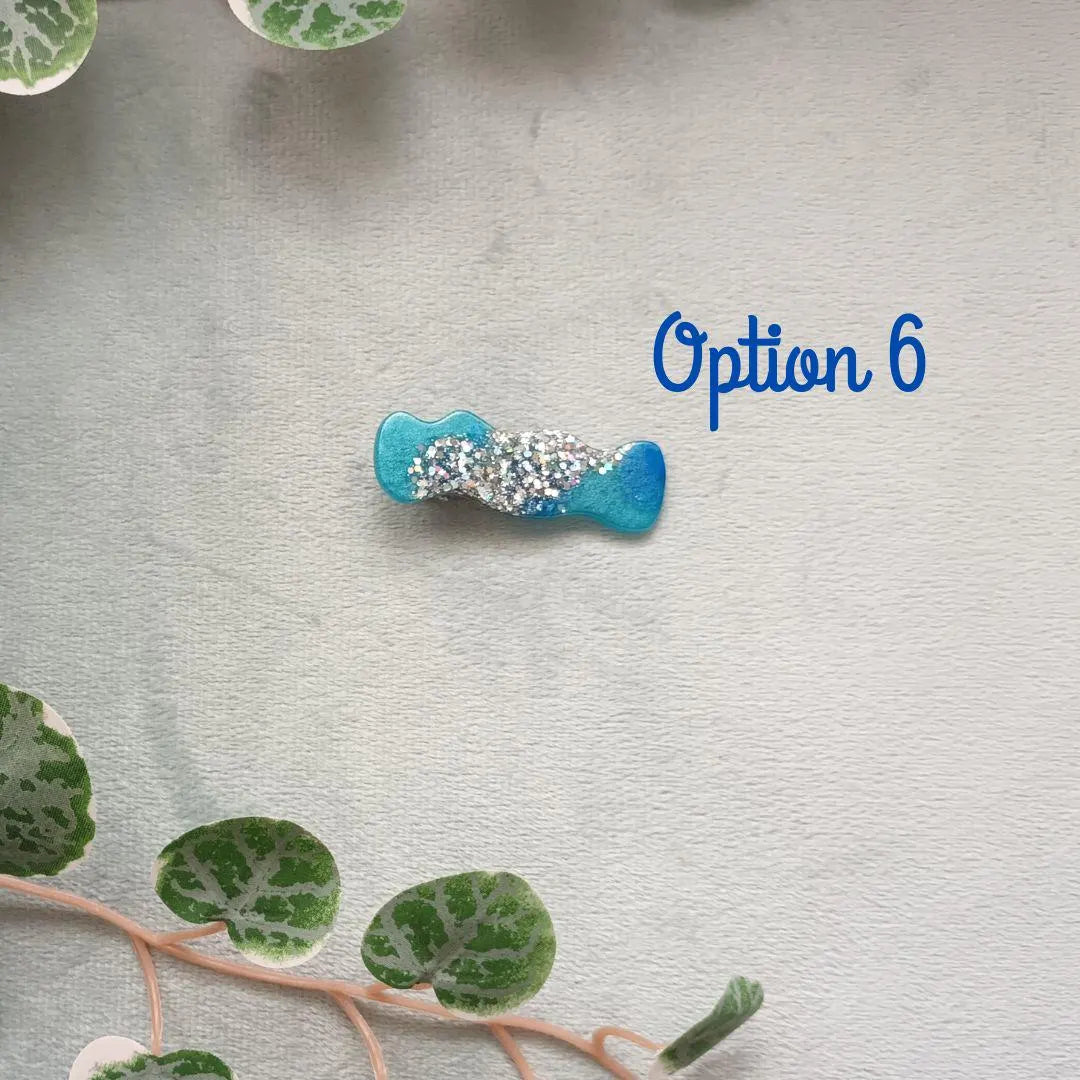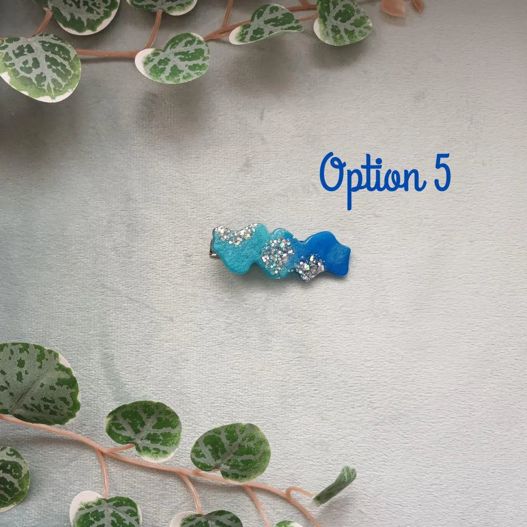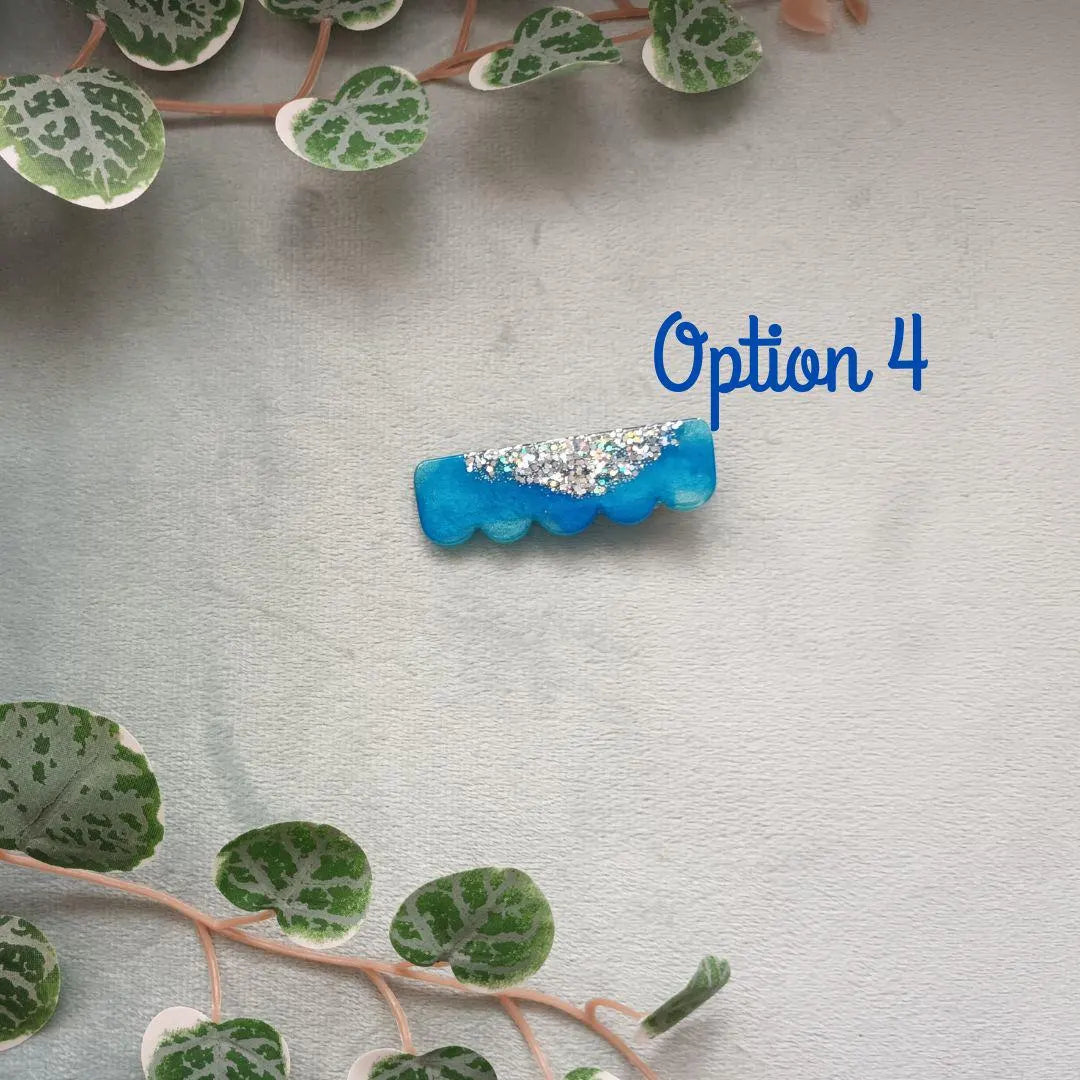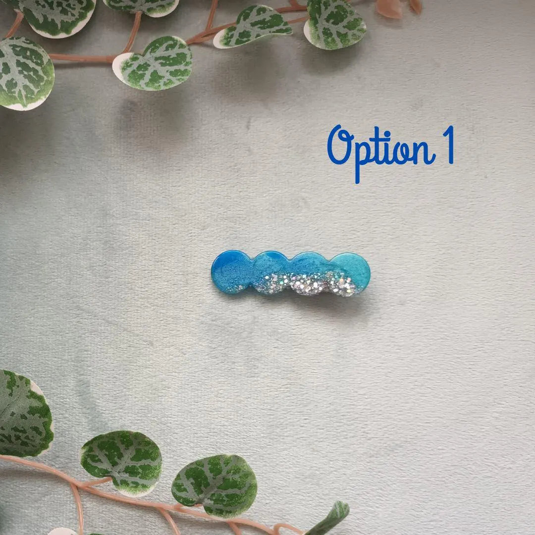 Laissez-vous emporter par la douceur des vagues avec les pinces à cheveux de la collection Océane. Chaque pièce est coulée à la main dans une résine bleue translucide, mêlant des nuances de bleu profond, turquoise et azur, rehaussées de paillettes argentées scintillantes comme l’écume de mer.